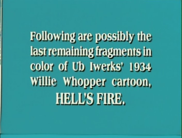 More importantly, however, the set contains two complete Willie Whopper cartoons which were released in Cinecolor. While known for decades to have been released in color "Hell's Fire" and "Davy Jones Locker" remained elusive but for black and white 16mm versions and a color fragment of "Hell's Fire" entitled 'Masquerade Holiday'. When a previous DVD release, 'Cartoons That Time Forgot', issued 'Masquerade Holiday' to VHS and later DVD in the 90's they prefaced the cartoon with a disclaimer that what they had might well be the only surviving color fragment of the film. In fact, there was a complete negative stored at UCLA the whole time which was unearthed in gathering materials for this set. Stanchfield gives a better (and more accurate) sense of the technical details in his short essay in the included booklet. If you are so inclined you can get a sense of life before this discovery and restoration by reading my (admittedly badly written and more than a little crazy) series on the only complete, at least as was generally thought of at the time, version of "Hell's Fire": Vulcan Entertains.